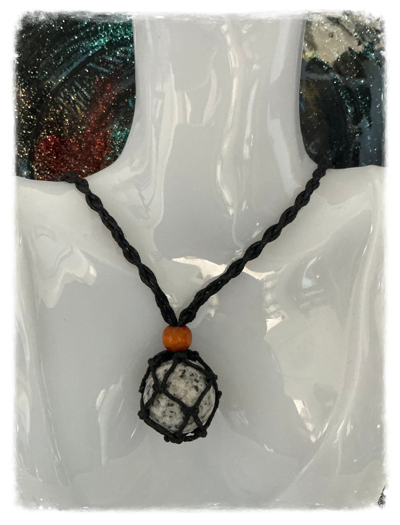 Bille minérale enchâssée dans cage d’un cordon en fibre de polyester tressée