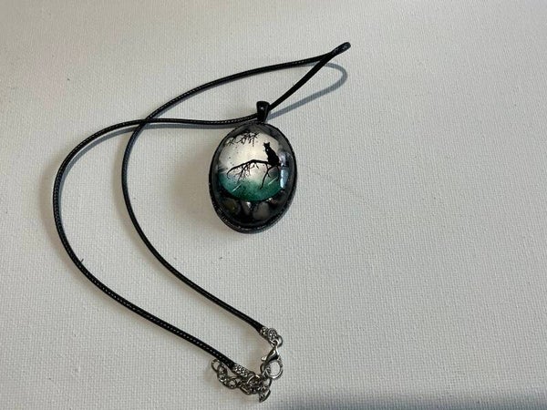 Pendentif en résine avec inclusion cabochon chat au clair de lune, éclats d’ormeaux et paillettes.