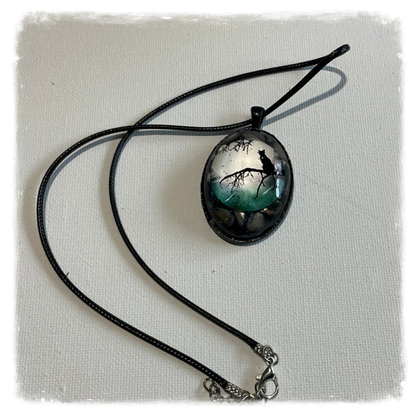 Pendentif en résine avec inclusion cabochon chat au clair de lune, éclats d’ormeaux et paillettes.