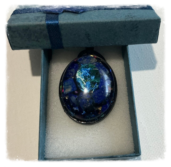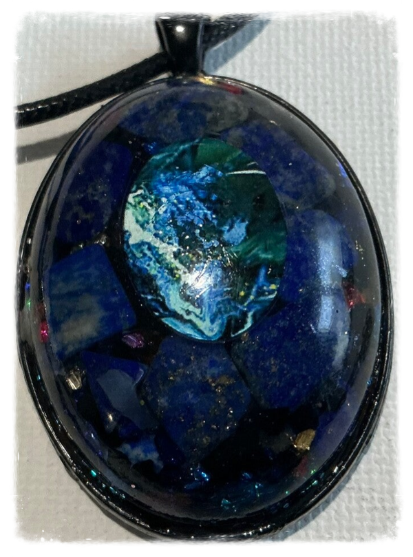 Pendentif en résine avec inclusion cabochon planète, sodalite et paillettes.