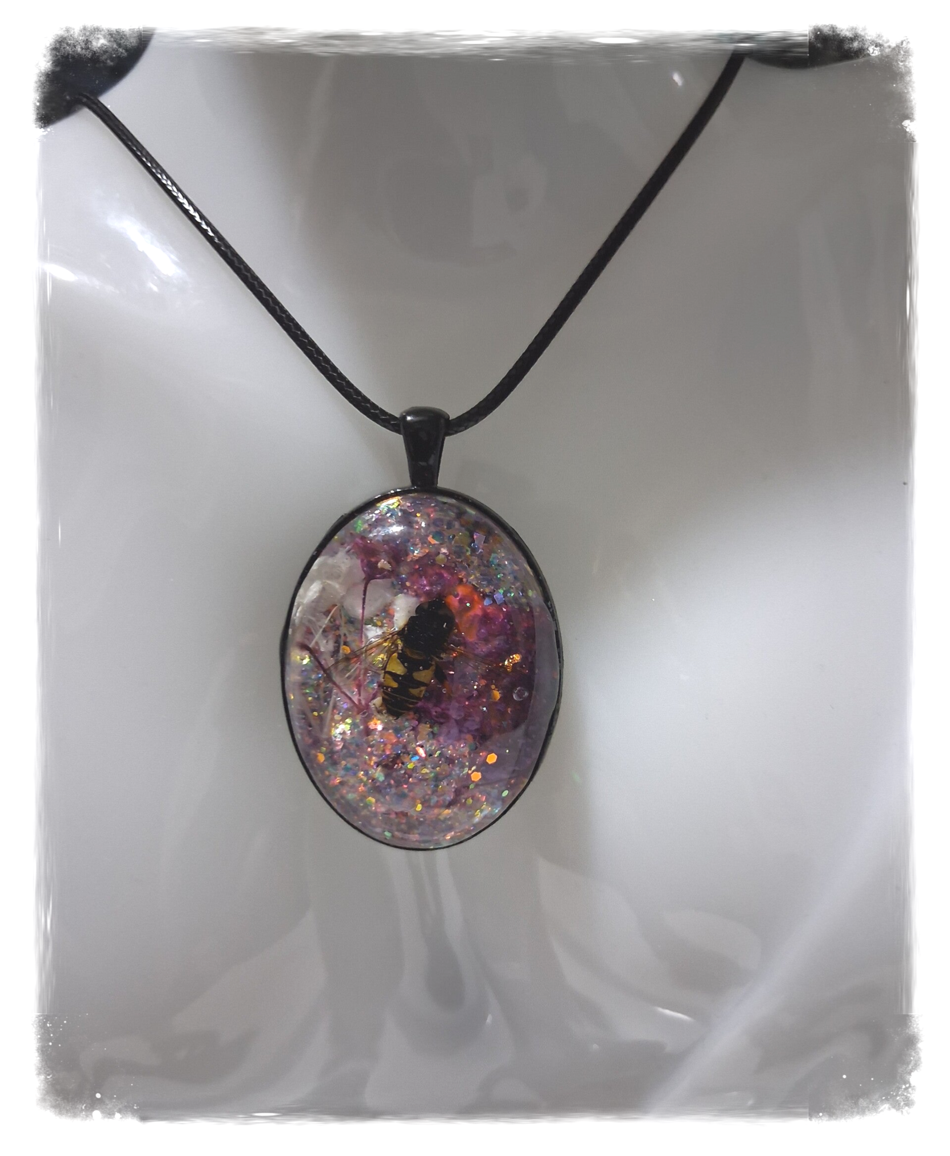Pendentif en résine avec inclusion d'une abeille (trouvée morte), végétaux et paillettes