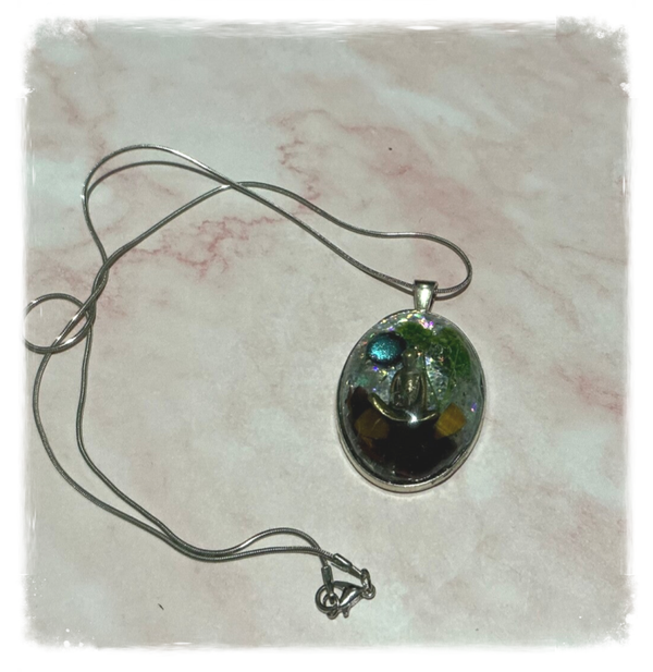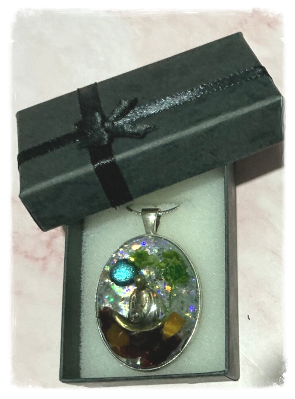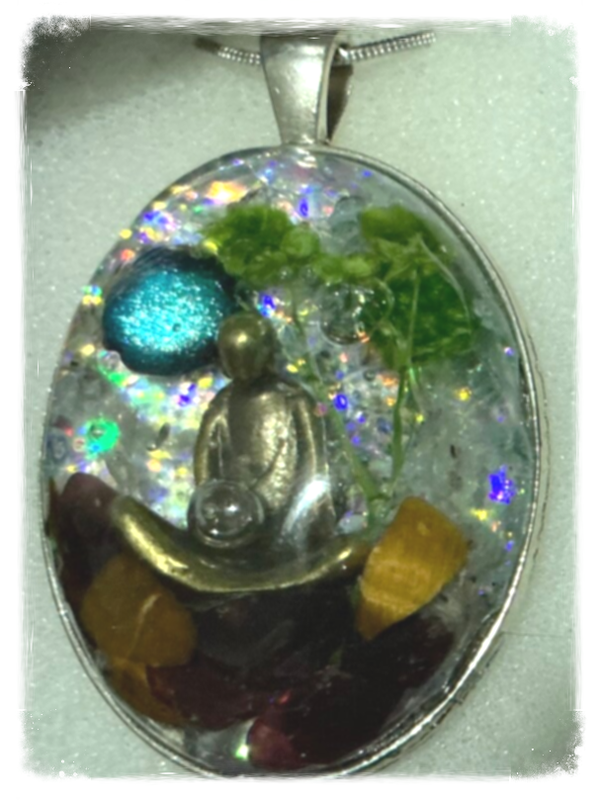 Pendentif en résine saynète "Moine méditant en forêt " la lune s'illumine à la lumière