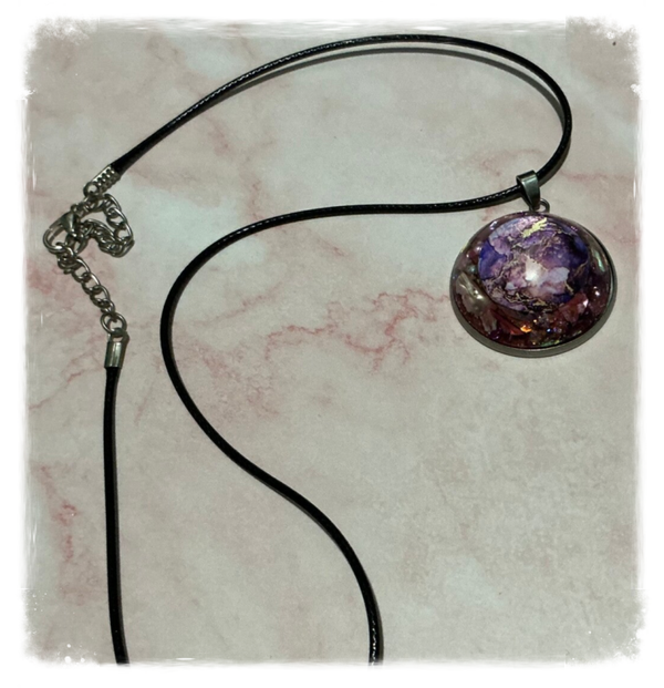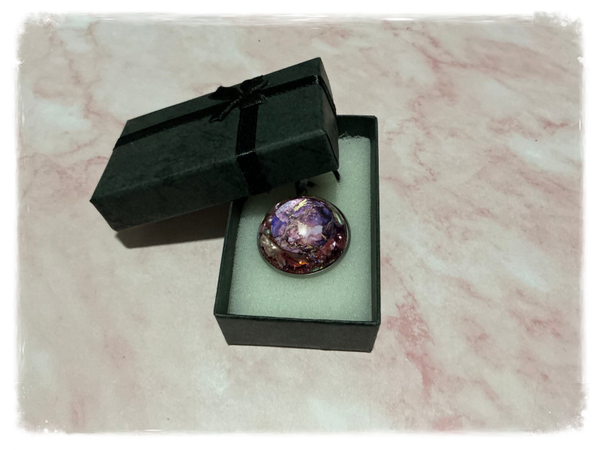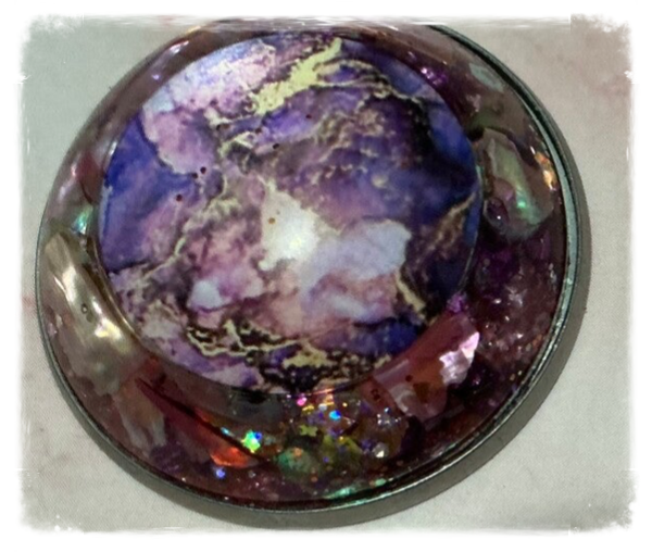 Pendentif en résine avec inclusion cabochon effluves psychédélique roses éclats d’ormeaux et paillettes.