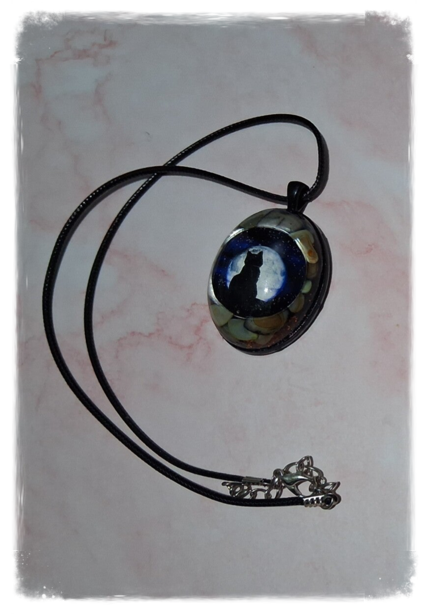 Pendentif en résine avec inclusion cabochon chat au clair de lune, éclats d’ormeaux et paillettes.