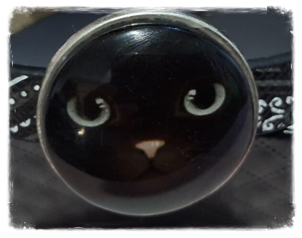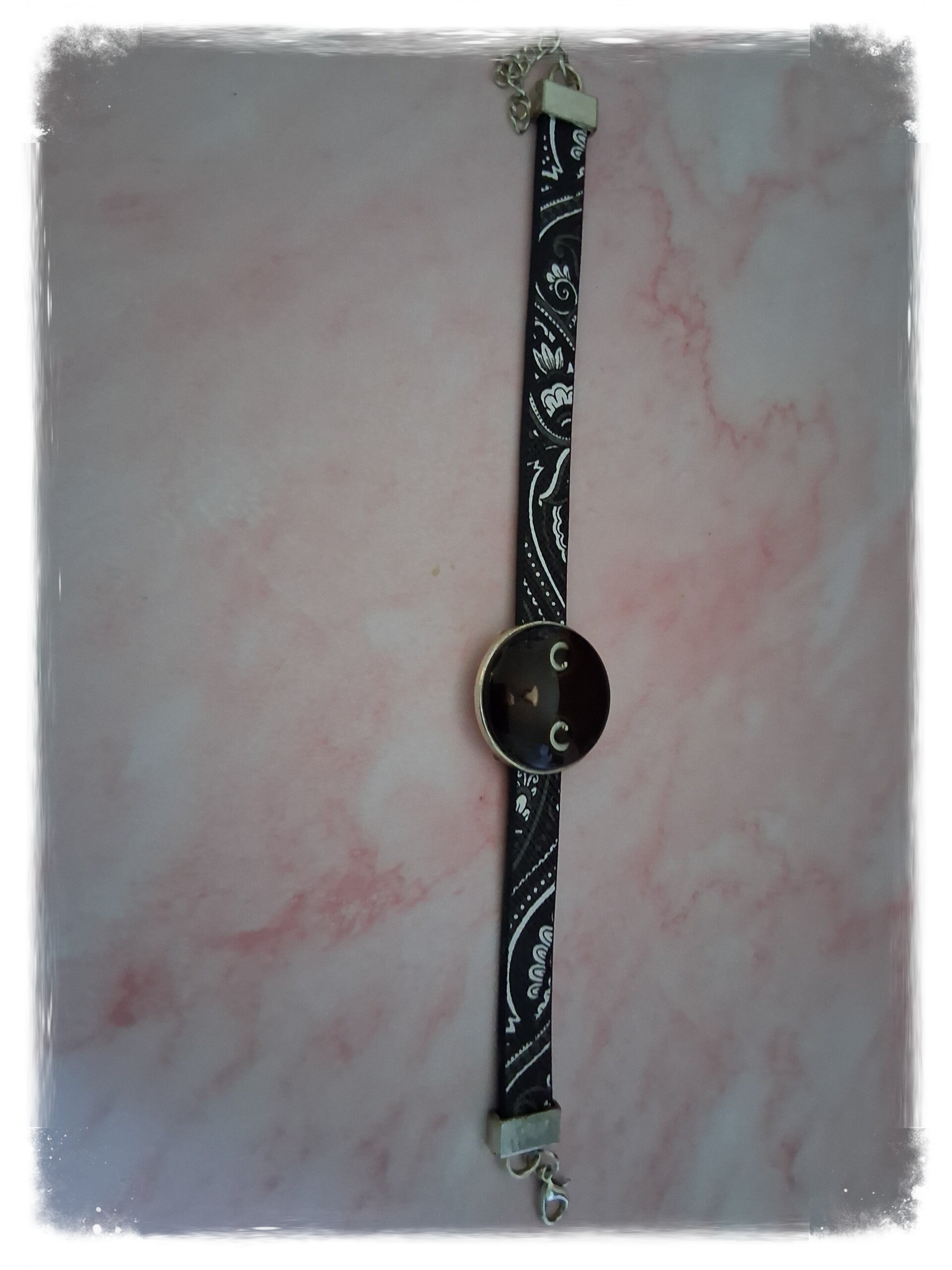 Bracelet doublé cuir avec cabochon Regard intense de Chat noir .