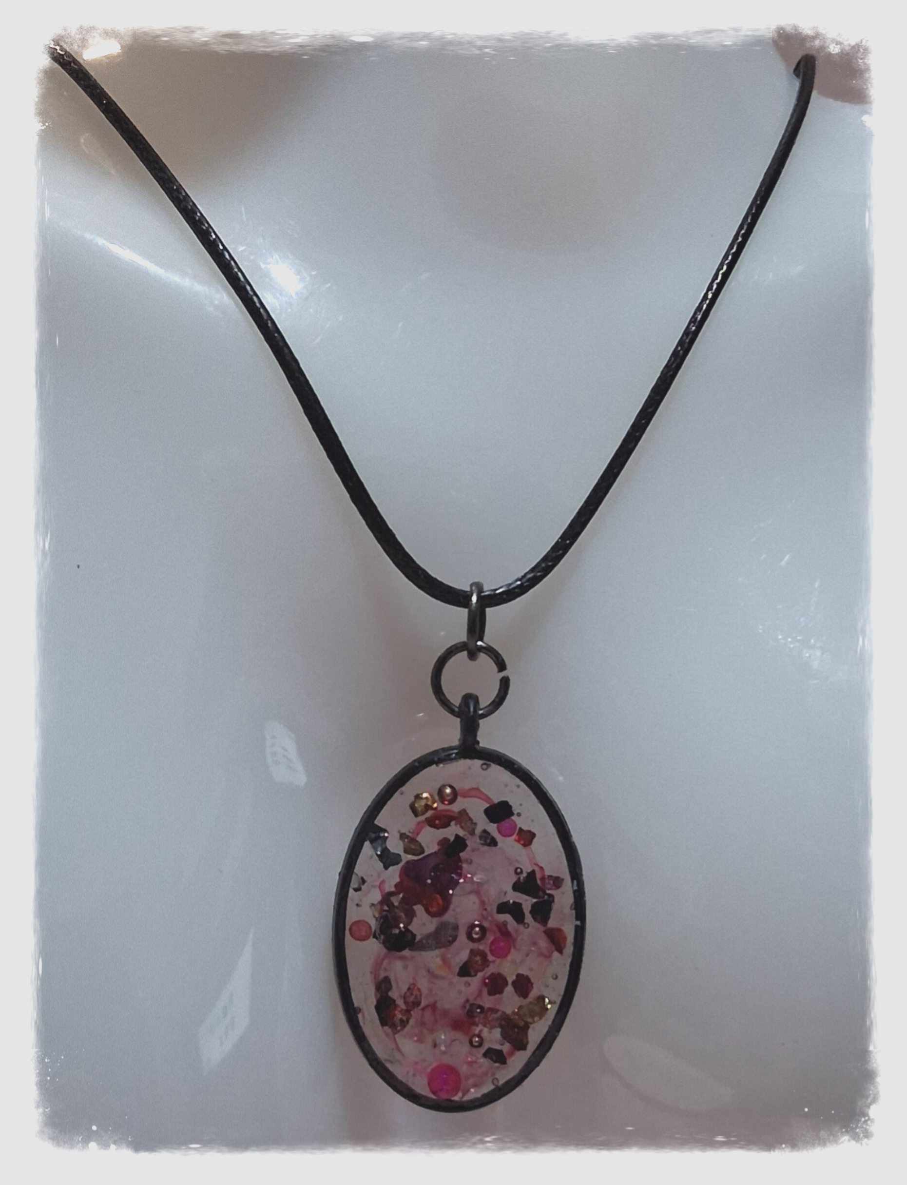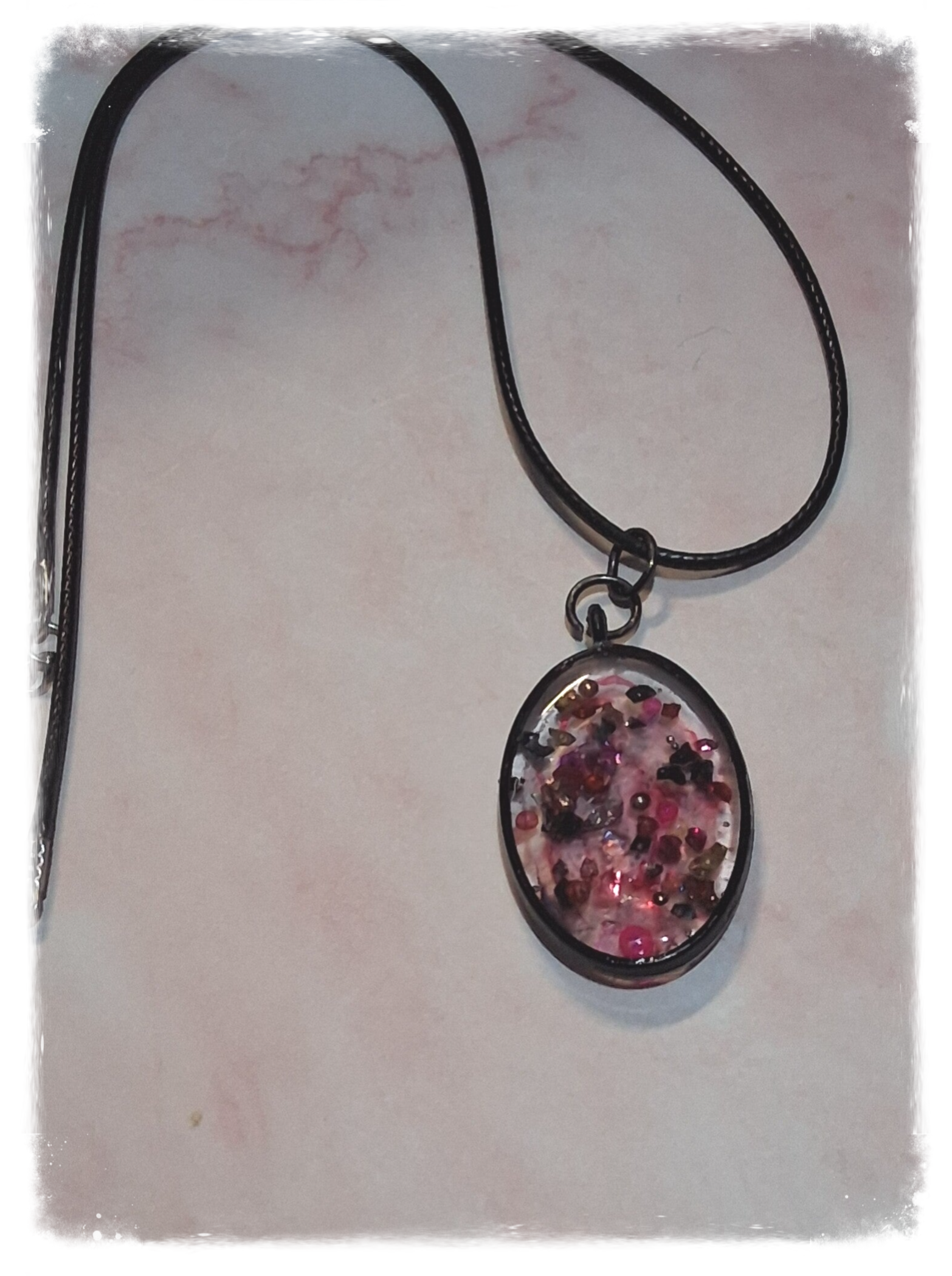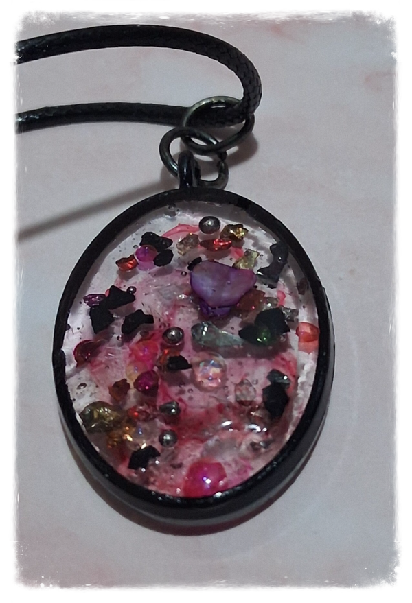 Pendentif résine avec inclusion éclats ormeaux violets et paillettes