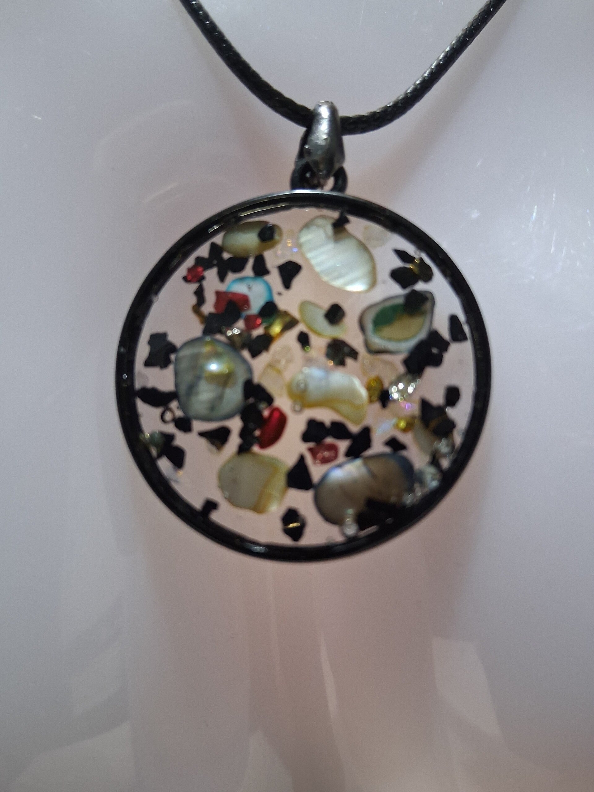 Pendentif en résine avec inclusion éclats d’ormeaux gris et paillettes en éclats de Verre Brisé Métallisé,