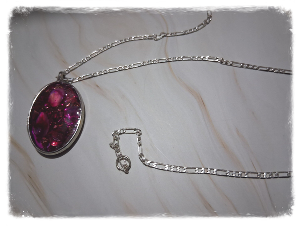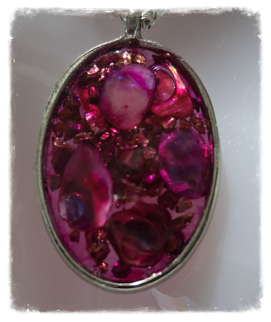 Pendentif résine avec inclusion éclats ormeaux violets et paillettes